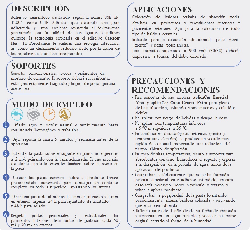 Adhesivo cementoso clasificado según la norma UNE EN 12004 como C1TE. Adhesivo que desarrolla una gran adherencia y una excelente resistencia al deslizamiento garantizada por la calidad de sus ligantes y aditivos quimicos. La tecnología empleada en el adhesivo Capacer Plus TT Porcelánico le confieren una reología adecuada, así como un deslizamiento reducido dado por la acción de los copolímeros que lleva incorporados.