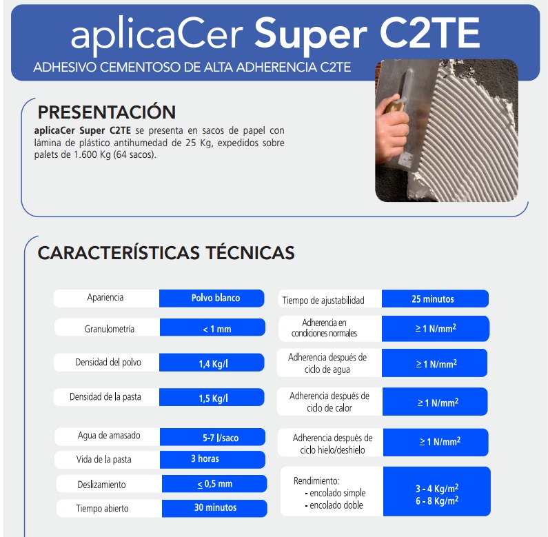 Adhesivo cementoso clasificado según la norma UNE EN 12004 como C2TE. Adhesivo compuesto por ligantes hidráulicos que desarrollan altas resistencias, ligantes químicos que confieren una gran adherencia y un tiempo abierto ampliado.