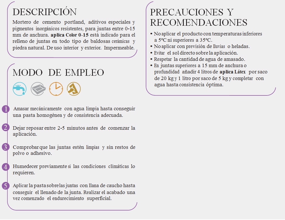 Mortero de cemento portland, aditivos especiales y pigmentos inorgánicos resistentes, para juntas entre 0-15 mm de anchura. aplica Color 0-15 está indicado para el relleno de juntas en todo tipo de baldosas cerámicas y piedra natural. De uso interior y exterior. Impermeable.