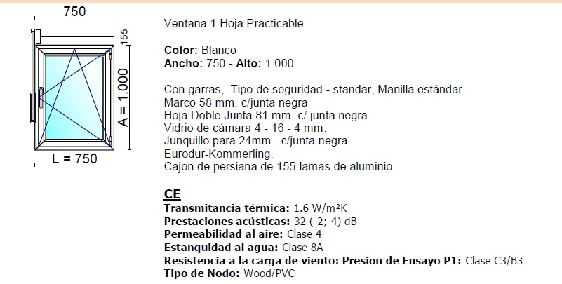SUMINISTRO DE VENTANA PVC Kömmerling con persiana "ABATIBLE-PRACTICABLE / OSCILO BATIENTE" DE 1 HOJA - CON VIDRIO DOBLE TIPO CLIMALIT 4/16/4 mm.